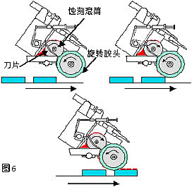 滾印技術是源于凹版印刷,兩者均普遍使用于圓柱表面或連續印刷平面物件。這種機型采用滾動式的矽膠頭和滾筒式鋼板,油墨會從油盤或經管道覆蓋圖案,然后刀片再把多余的油墨刮去。當滾筒旋轉時,膠頭就能從鋼板上取得圖案,然后移到物件上。(圖6)