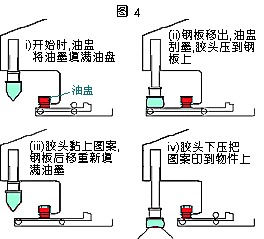 油墨在這機款中是放置于倒轉的密封式油盅里(圖4)。油盅緊貼于鋼板表面,令油墨不會漏出。同時間,油盅也有刀片的作用,在鋼板上來回移動,把油墨留在蝕刻圖案上。這裝置的好處是溶劑的揮發度可以降至最低。但要留意的是,油盅的價錢是可以很貴的,所以需要小心地使用。油盅的類型越來越多變,無論在尺寸及設計方面,均能切合使用者之需要。
